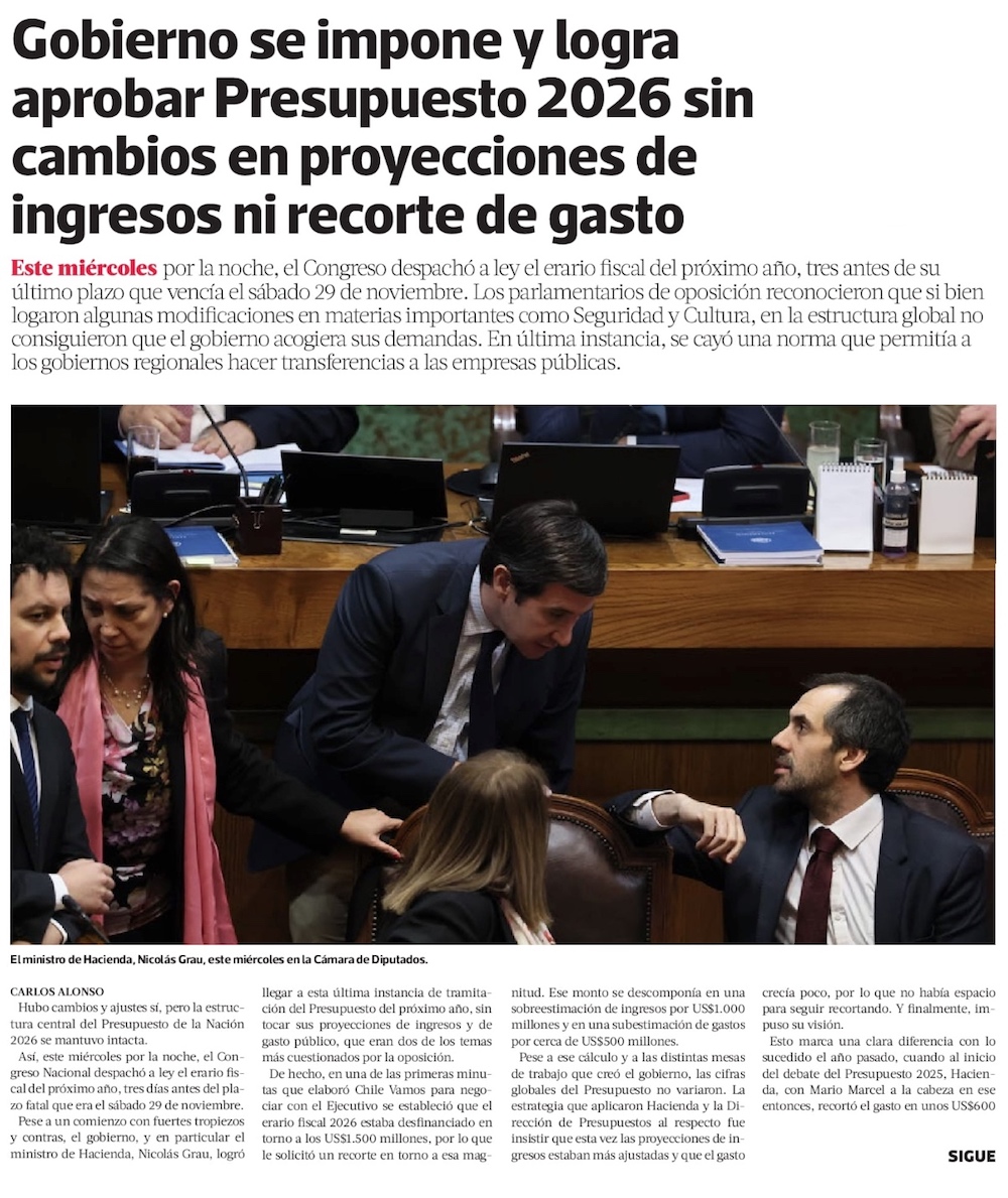 Congreso despacha el Presupuesto 2026 sin glosa republicana, pero con aumentos en Contraloría y Seguridad - (Diario Financiero)