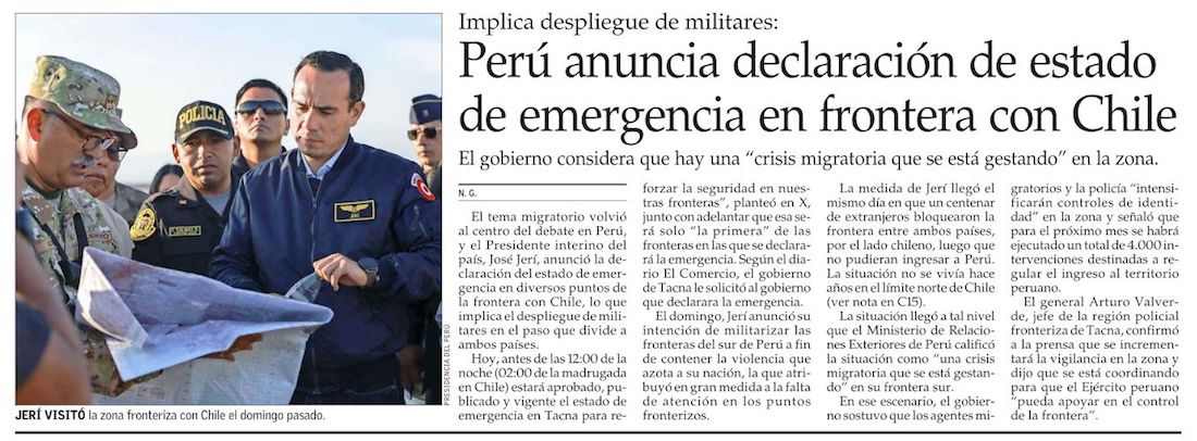 Arranca el estado de emergencia de Perú en la frontera con Chile - (El Mercurio de Santiago)