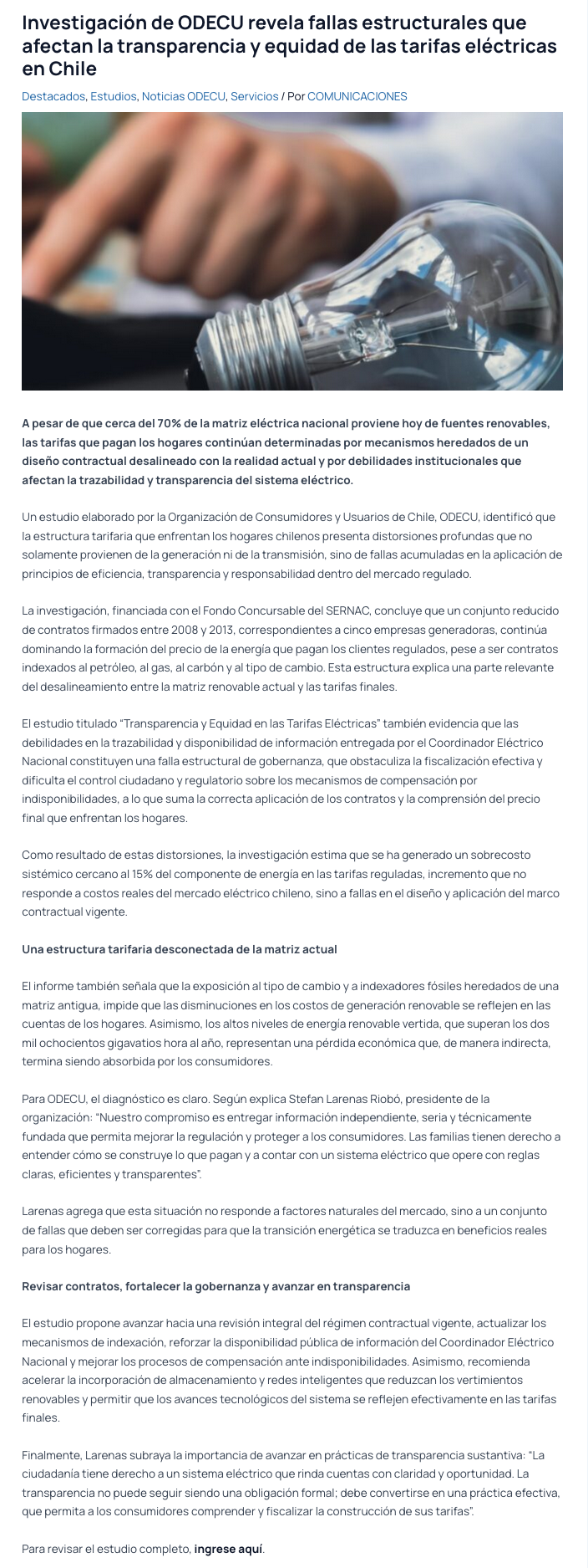 Estudio de ODECU revela fallas estructurales que distorsionan las tarifas eléctricas en Chile - (induambiente.cl)
