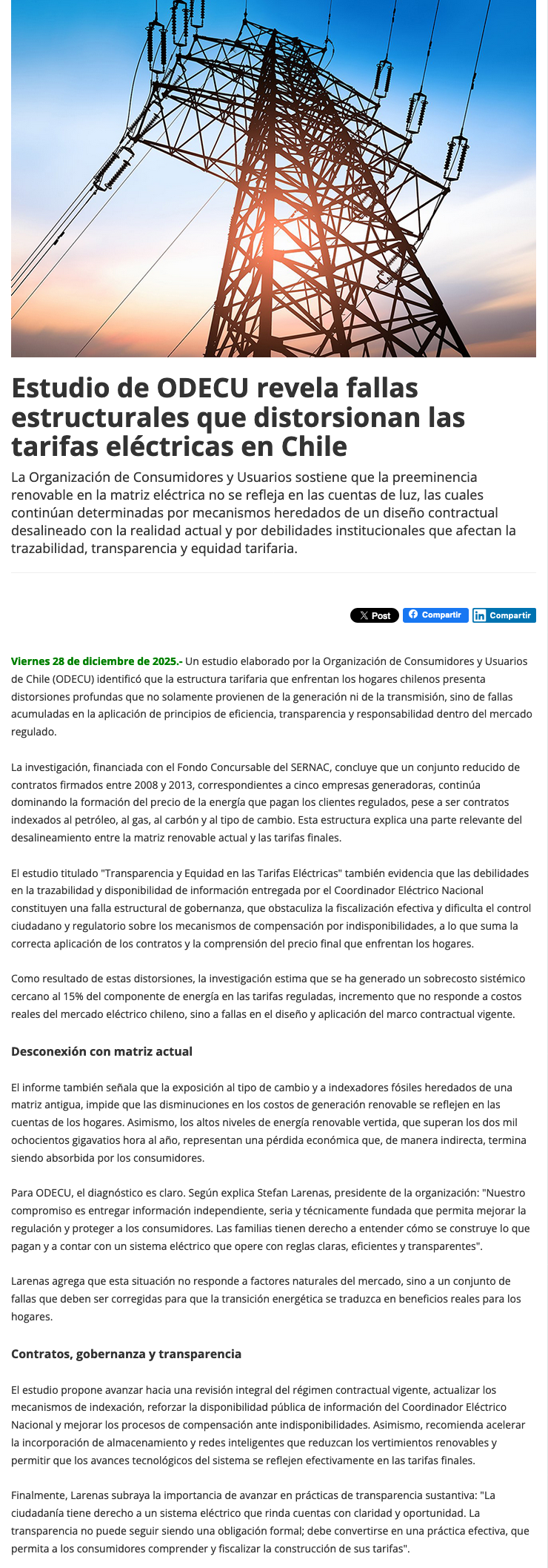 Investigación de ODECU revela fallas estructurales que afectan la transparencia y equidad de las tarifas eléctricas en Chile - (odecu.cl)