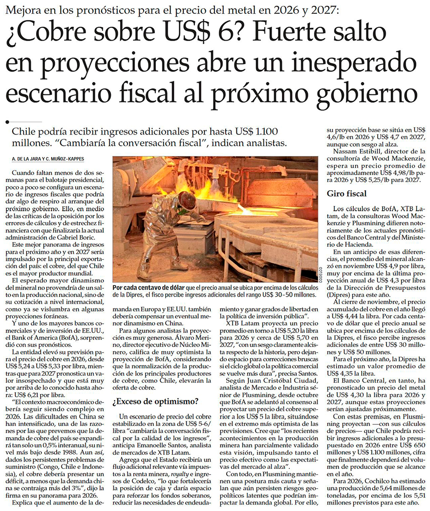 Mercado se entusiasma: cobre en US$ 5 le reportaría al Fisco al menos US$ 2 mil millones de ingresos extra el próximo año - (Diario Financiero)