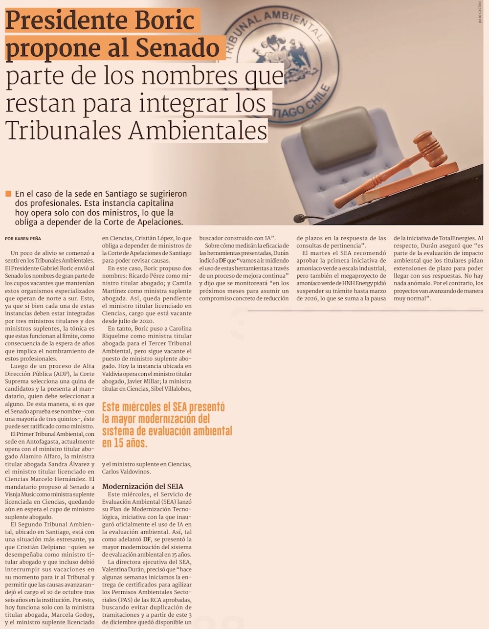La vacancia de ministros en los tribunales ambientales llega hasta 2 mil días y el Gobierno propone cuatro nombramientos - (El Mercurio de Santiago)