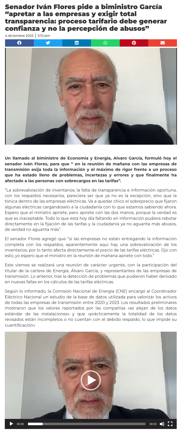 Senadora Provoste por denuncia del Ministerio de Energía por deficiente entrega de datos de transmisoras en proceso de fijación de tarifas eléctricas - (g5noticias.cl)