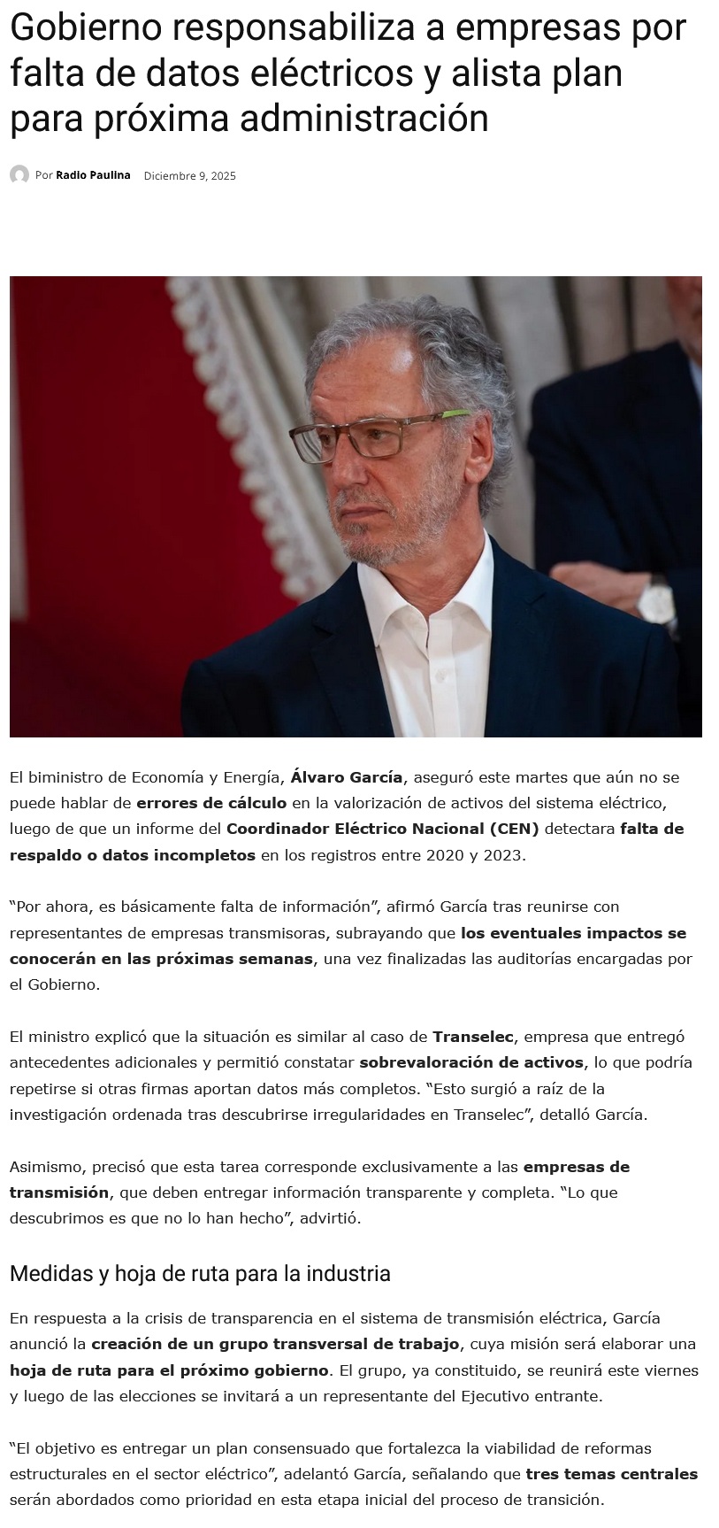 Biministro García anuncia Comité de Expertos para proponer mejoras a la regulación eléctrica y se reúne con empresas transmisoras - (Estrategia)