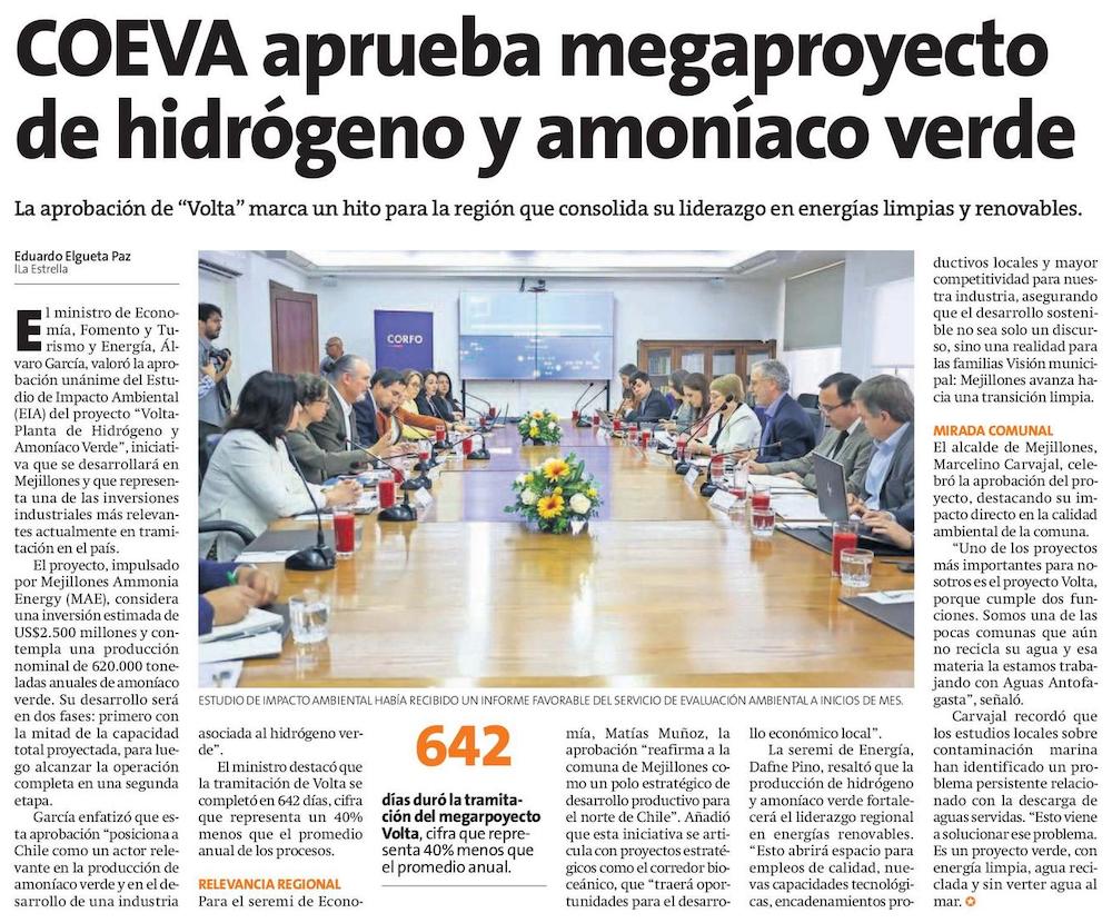 Volta abre camino al hidrógeno y el amoniaco verde en Chile tras su aprobación ambiental - (El Mercurio de Antofagasta)