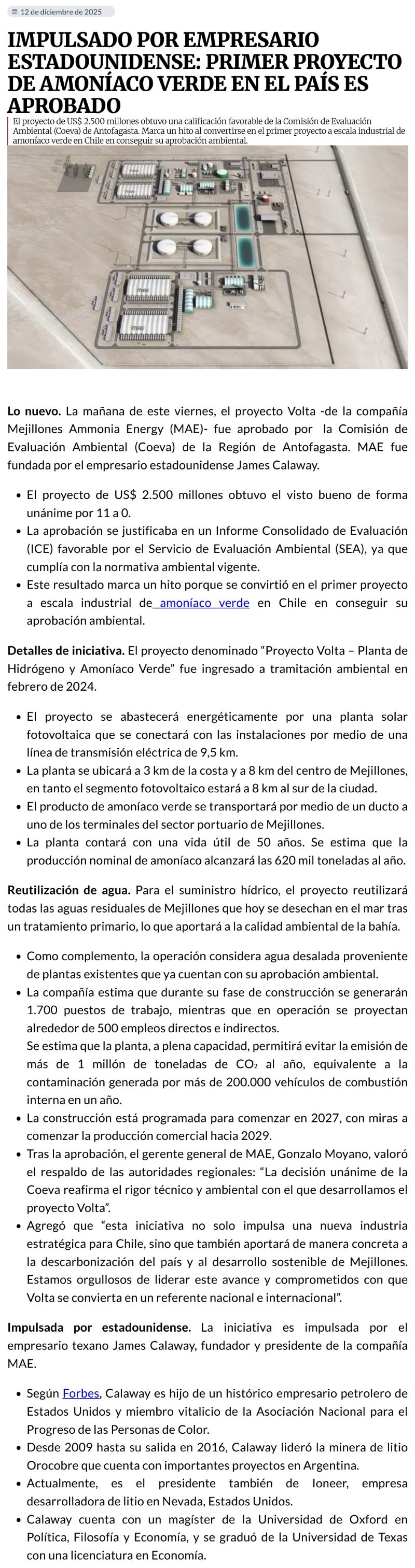 Volta abre camino al hidrógeno y el amoniaco verde en Chile tras su aprobación ambiental - (El Mercurio de Antofagasta)