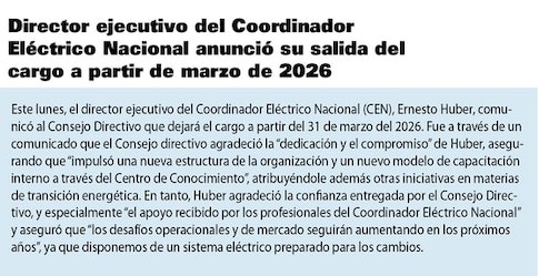 Ernesto Huber dejará cargo de director ejecutivo del Coordinador Eléctrico - (El Mercurio de Santiago)