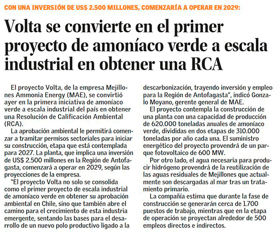 Proyecto de US$ 2.500 millones se convierte oficialmente en la primera iniciativa de amoníaco verde a escala industrial en obtener su RCA - (DF Online)