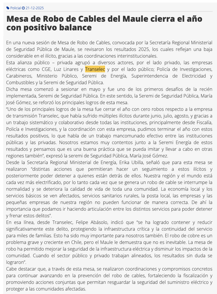 Mesa de Robo de Cables del Maule cierra el año con positivo balance - (El Heraldo (Linares))