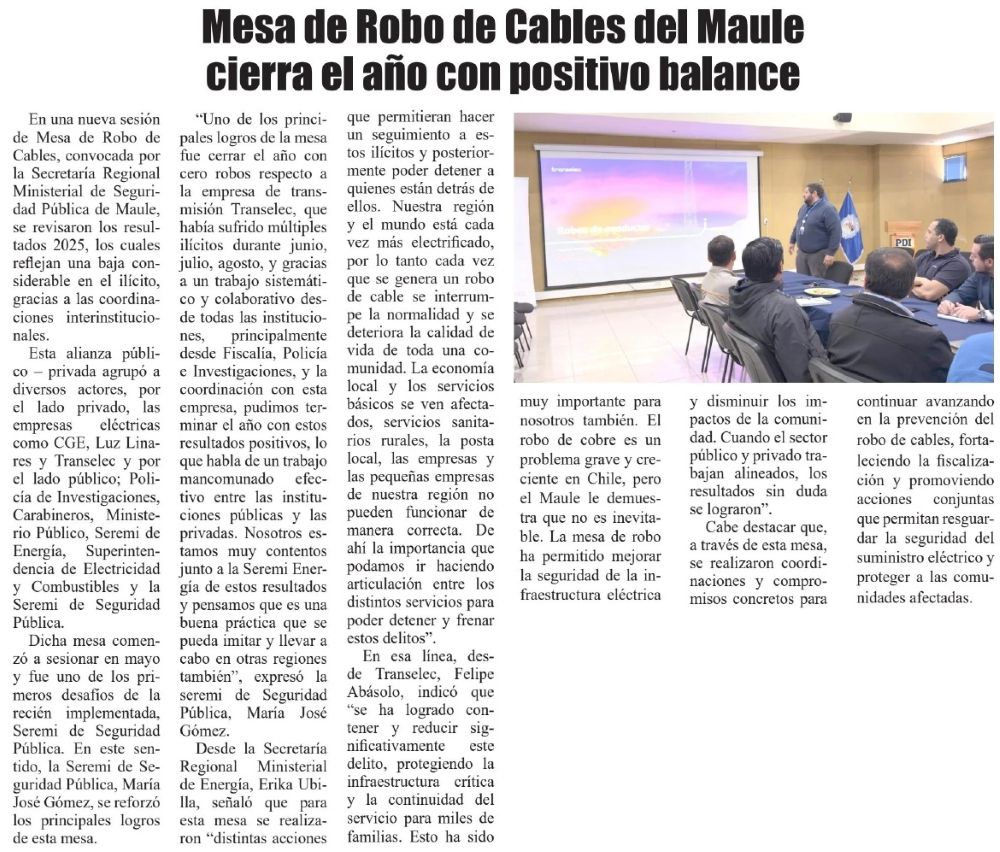 Mesa de Robo de Cables del Maule cierra el año con positivo balance - (diarioelheraldo.cl)