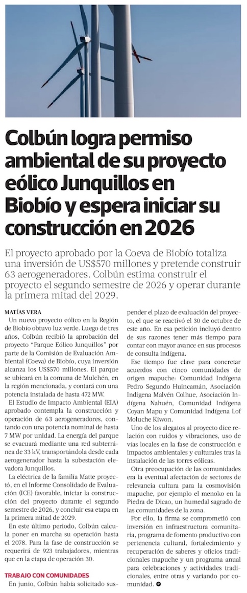 Colbún obtiene aprobación del parque eólico Junquillos por US$570 millones para su construcción en Biobío - (electromineria.cl)