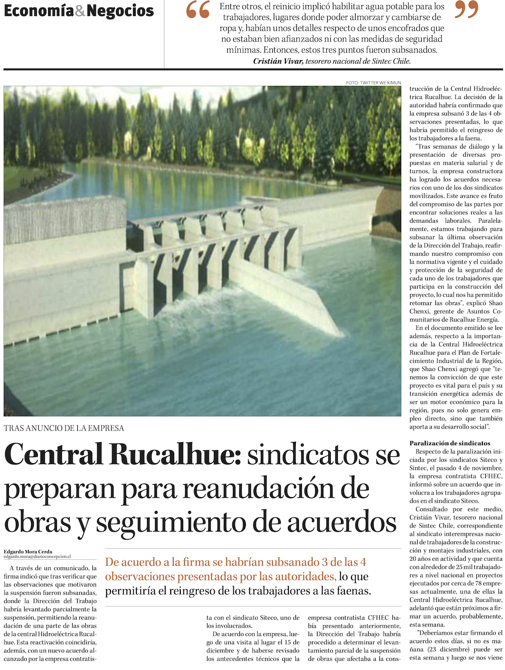 Dirección del Trabajo autoriza la reanudación parcial de las obras de la Central Hidroeléctrica Rucalhue - (Diario Financiero)