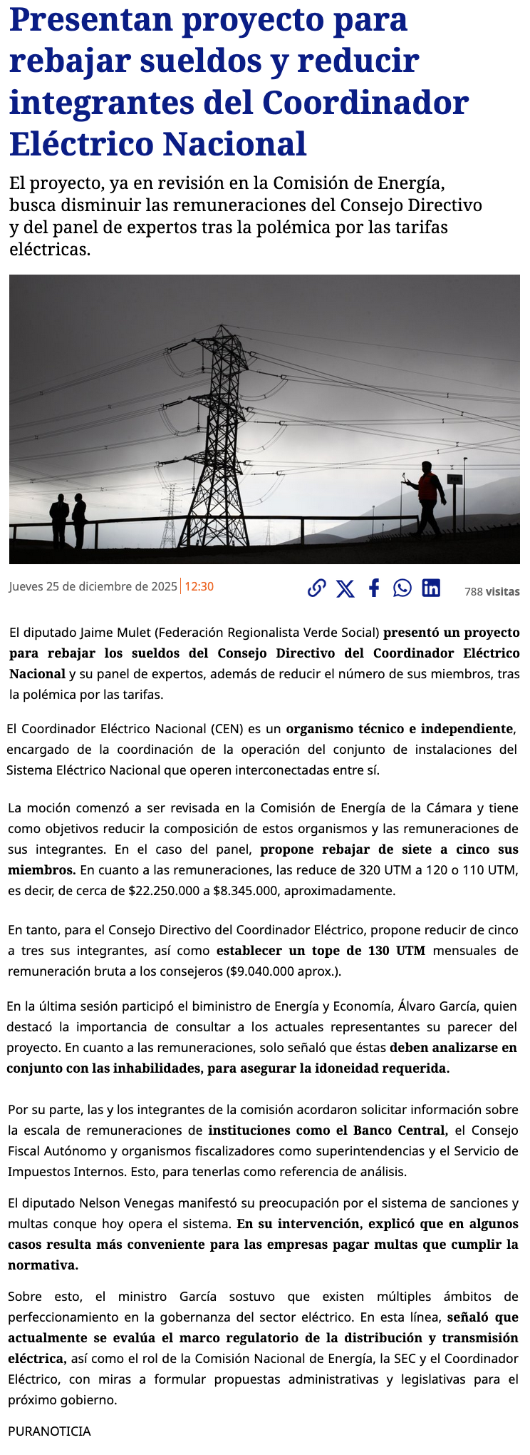Estudian iniciativa para reducir renta e integrantes del Coordinador Eléctrico Nacional - (Diario Concepción)