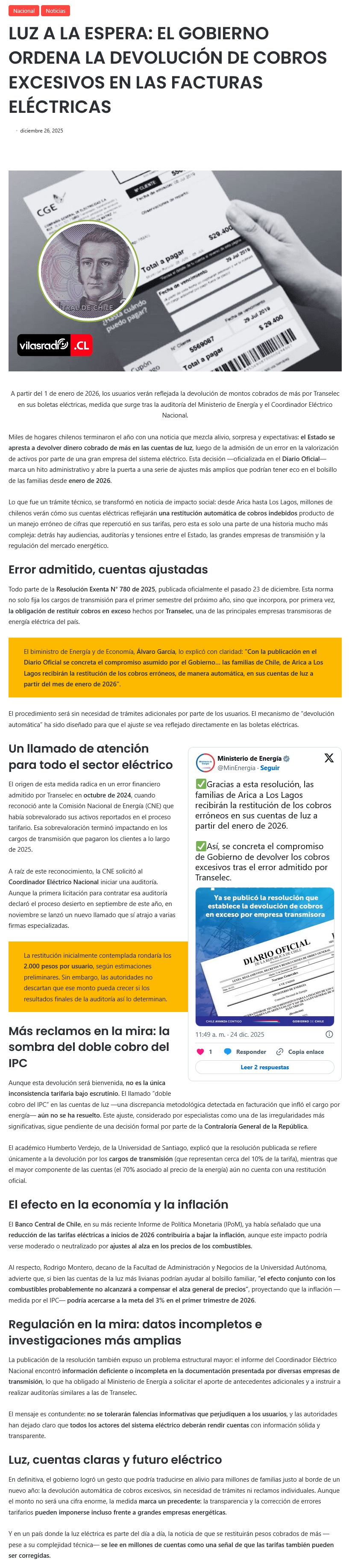 Gobierno anuncia devolución automática en cuentas de luz por cobros en exceso de Transelec - (portalinnova.cl)