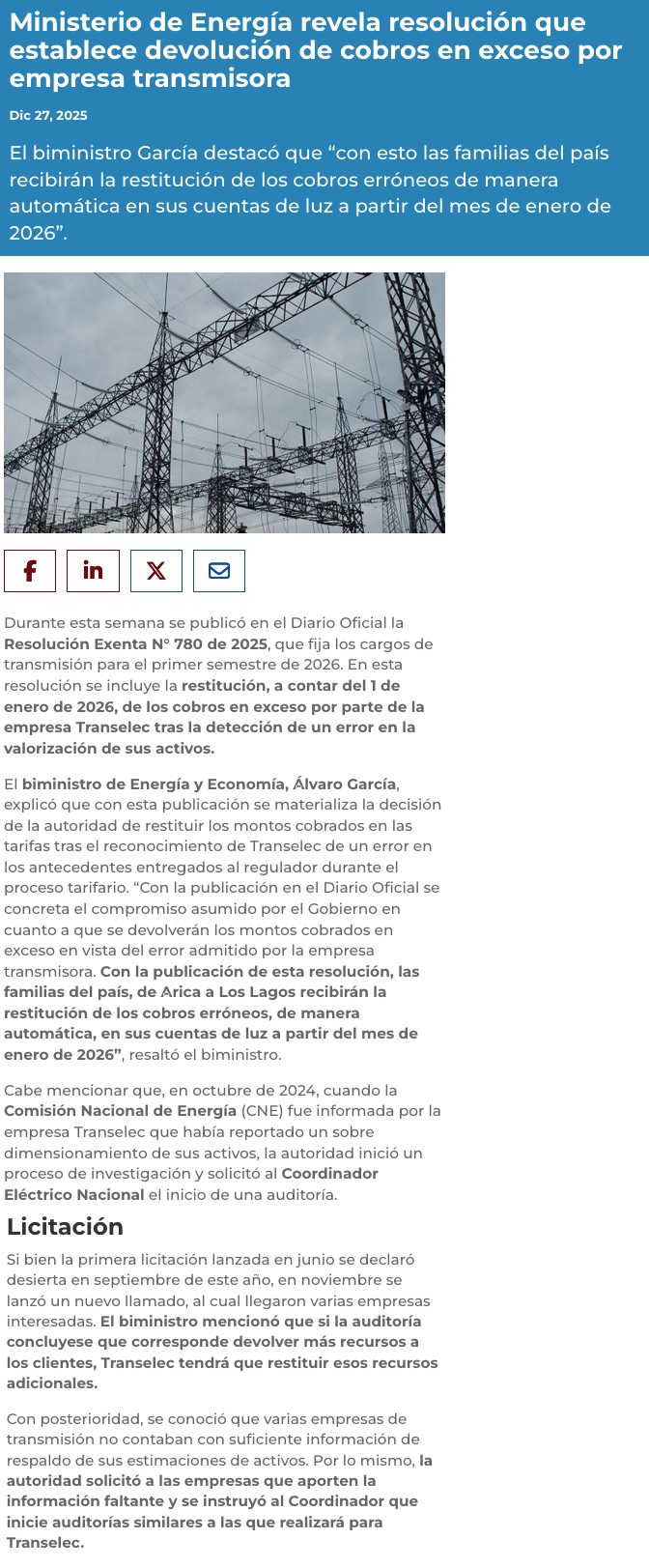 En enero de 2026 comenzará devolución de cargos de transmisión por error regulatorio - (chanarcillo.cl)