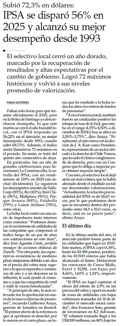IPSA cierra 2025 con su mejor desempeño en 32 años impulsado por mayor apetito por riesgo global y el factor Kast - (Diario Financiero)