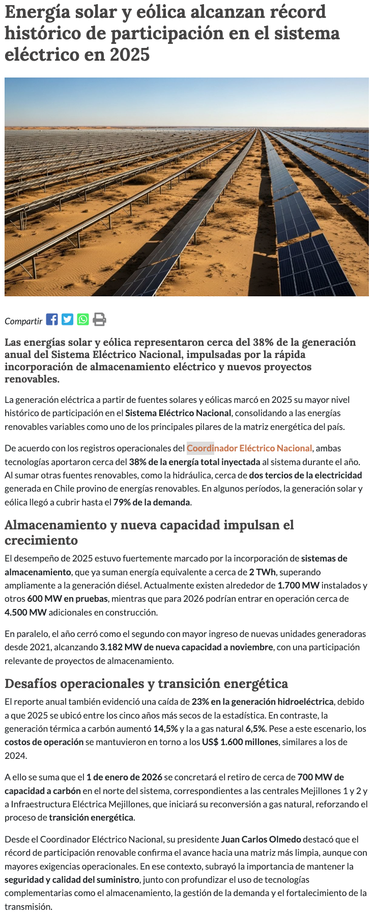 Récord histórico: Fuentes solares y eólicas aportaron cerca del 38% de generación eléctrica en 2025 - (diariousach.cl)