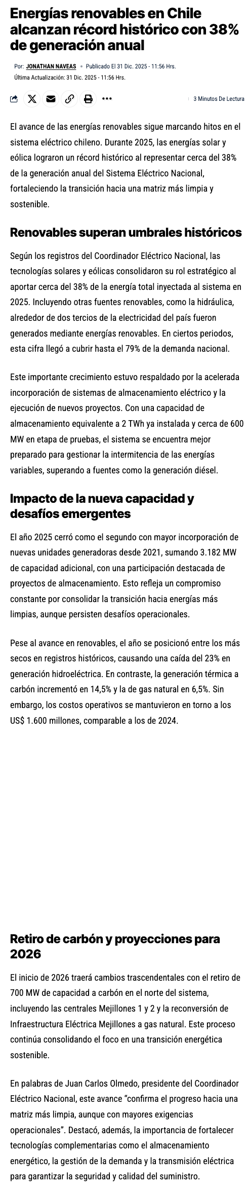 Récord histórico: Fuentes solares y eólicas aportaron cerca del 38% de generación eléctrica en 2025 - (diariousach.cl)