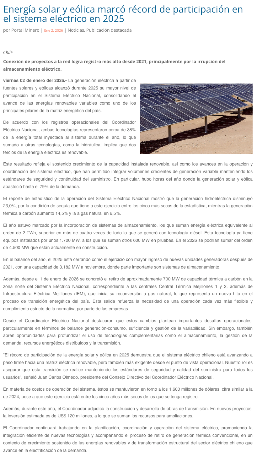 Energía solar y eólica marcó récord de participación en el sistema eléctrico este 2025 - (elzorronortino.cl)