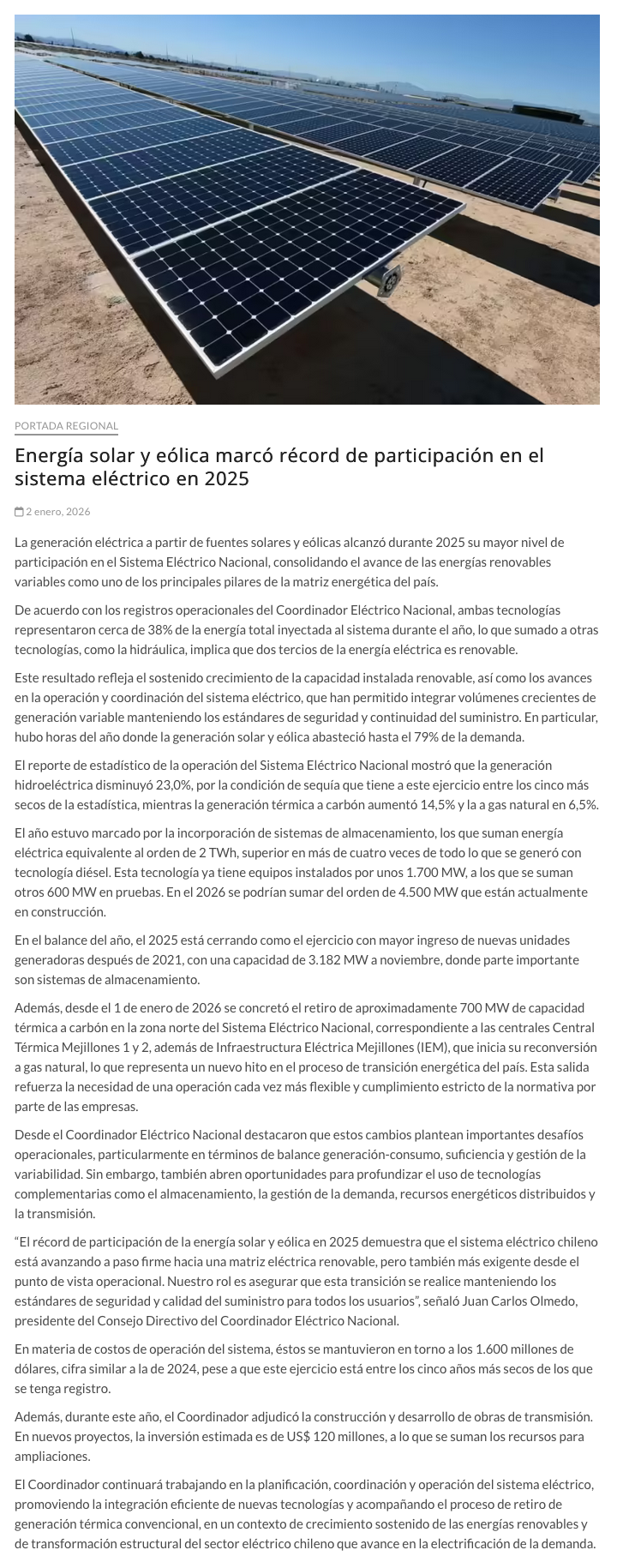 Energía solar y eólica marcó récord de participación en el sistema eléctrico este 2025 - (elzorronortino.cl)