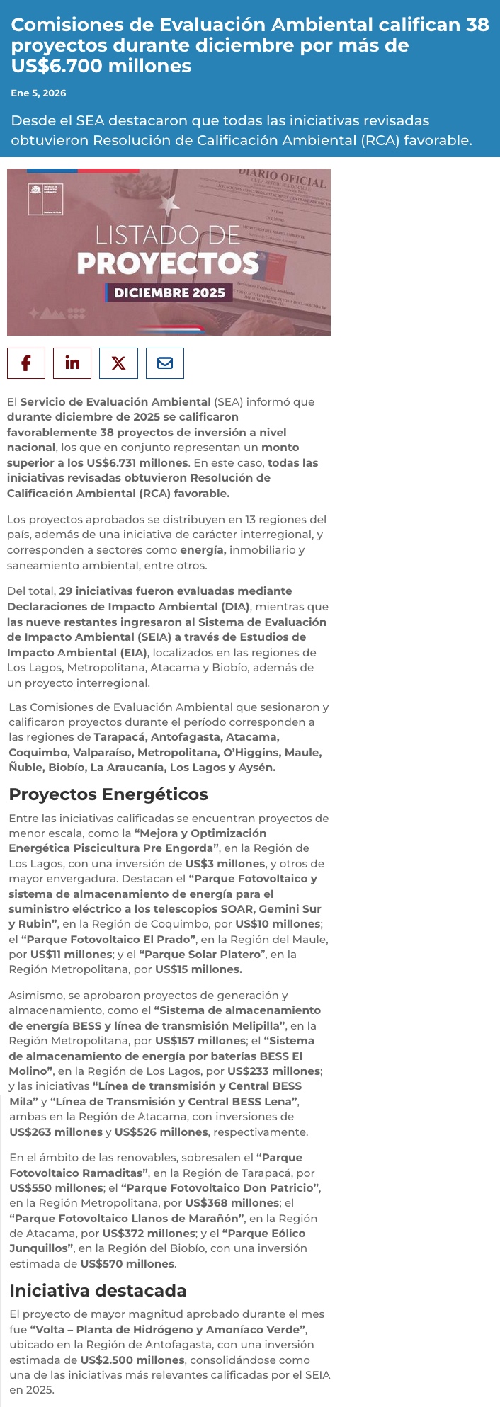 SEA: 17 proyectos energéticos fueron aprobados en diciembre, con una inversión total de US$3.700 millones - (chanarcillo.cl)
