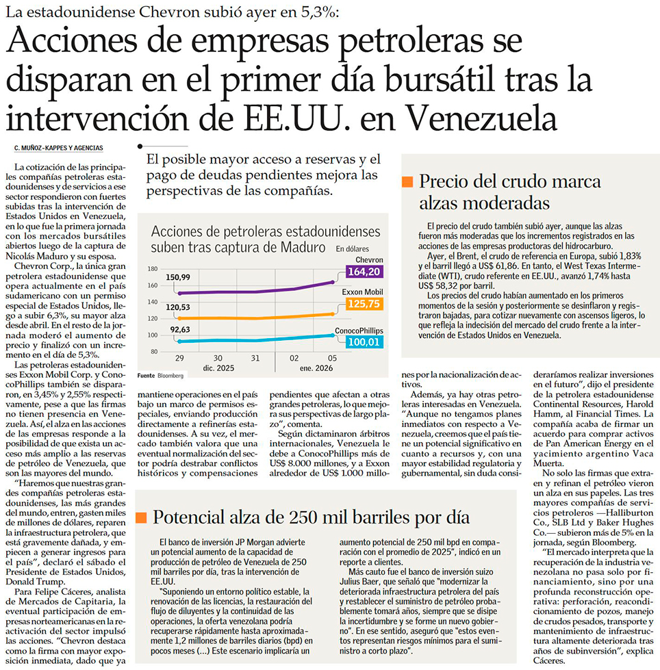 Petróleo reacciona con cautela tras captura de Maduro, pero acciones energéticas lideran en Wall Street - (Diario Financiero)