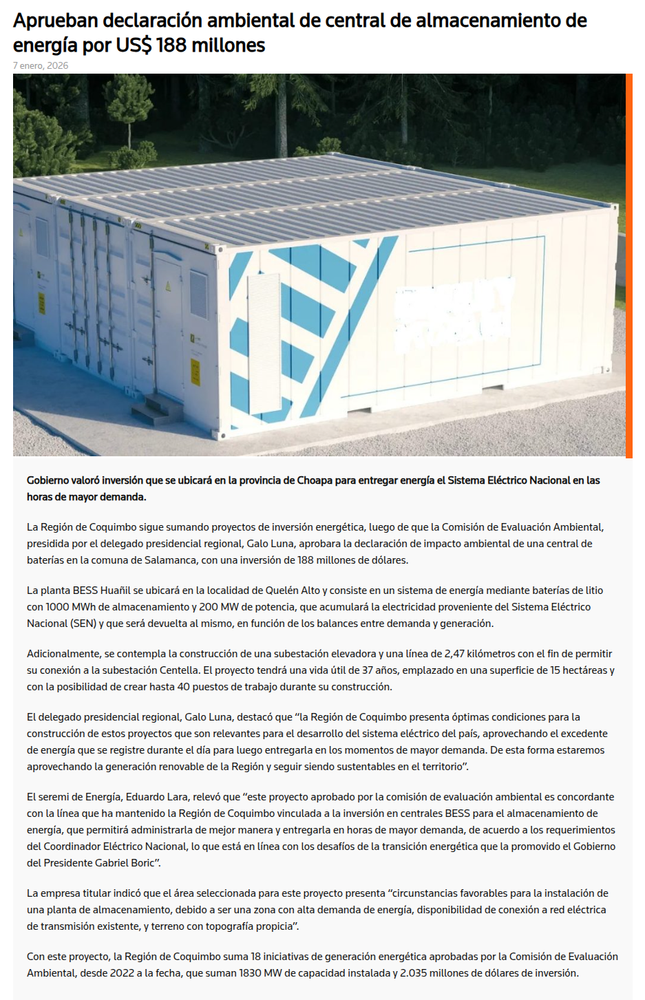 Aprueban declaración ambiental de central de almacenamiento por US$188 millones - (revistaei.cl)