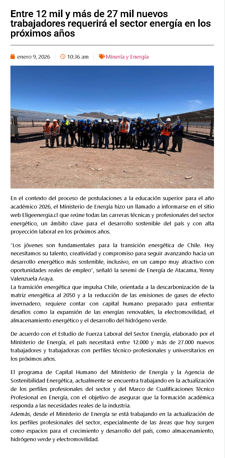 Sector Energía demandará entre 12 mil y 27 mil nuevos trabajadores - (El Diario de Atacama)