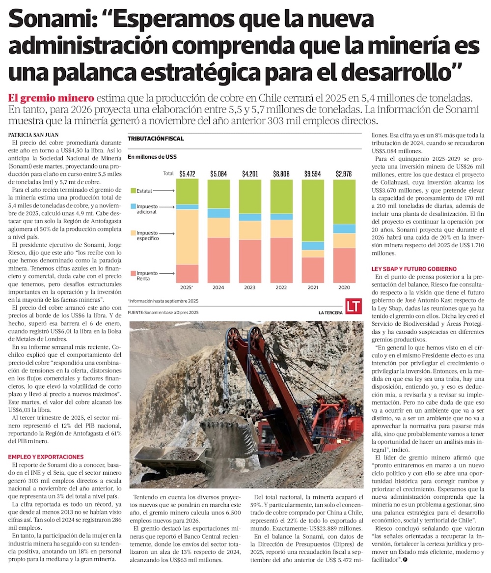 Sonami se alinea con Quiroz y dice que se puede elevar en 10% producción de cobre solo con cambios normativos - (Diario Financiero)