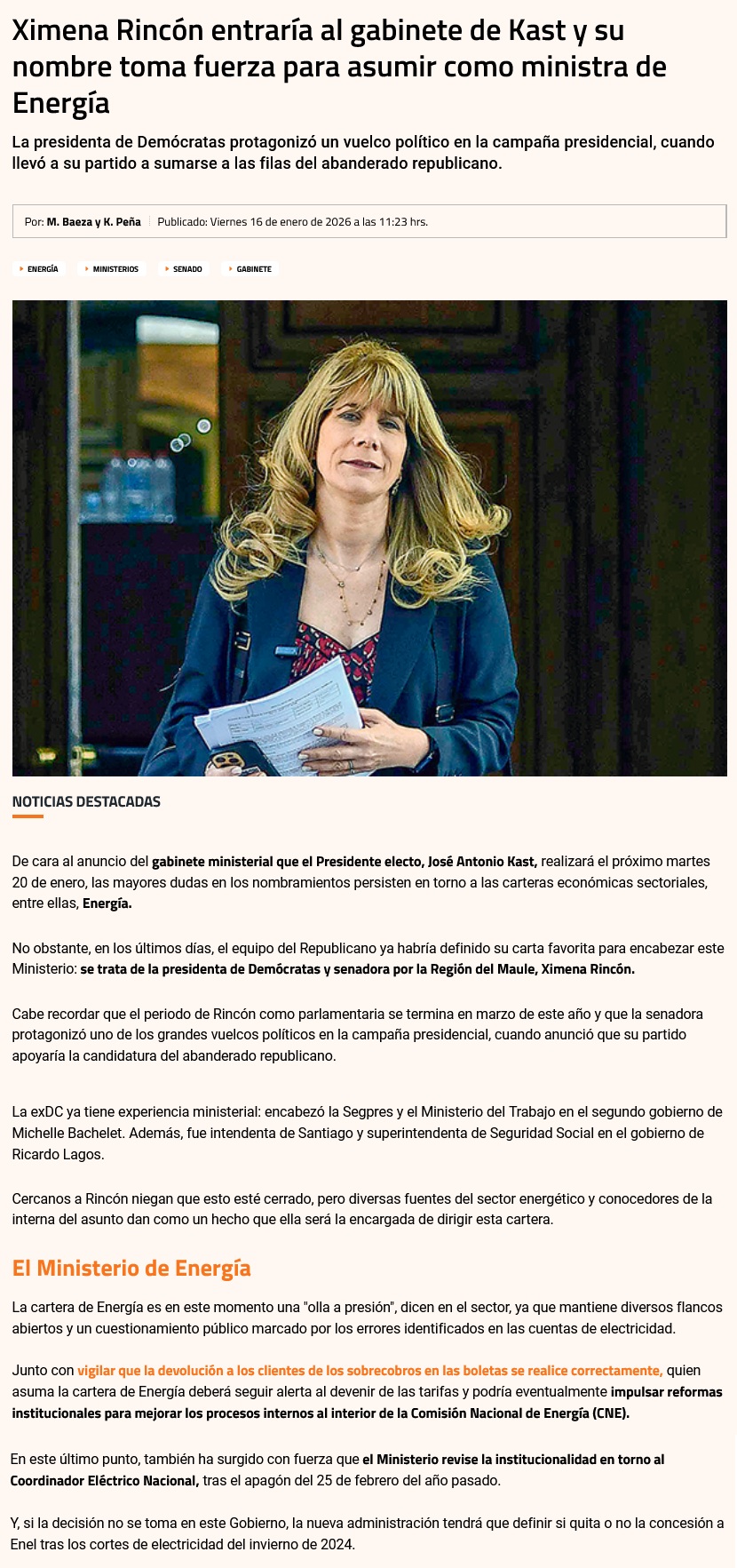 Golpe político de Kast: Ximena Rincón se instala como favorita para el Ministerio de Energía - (pagina7.cl)