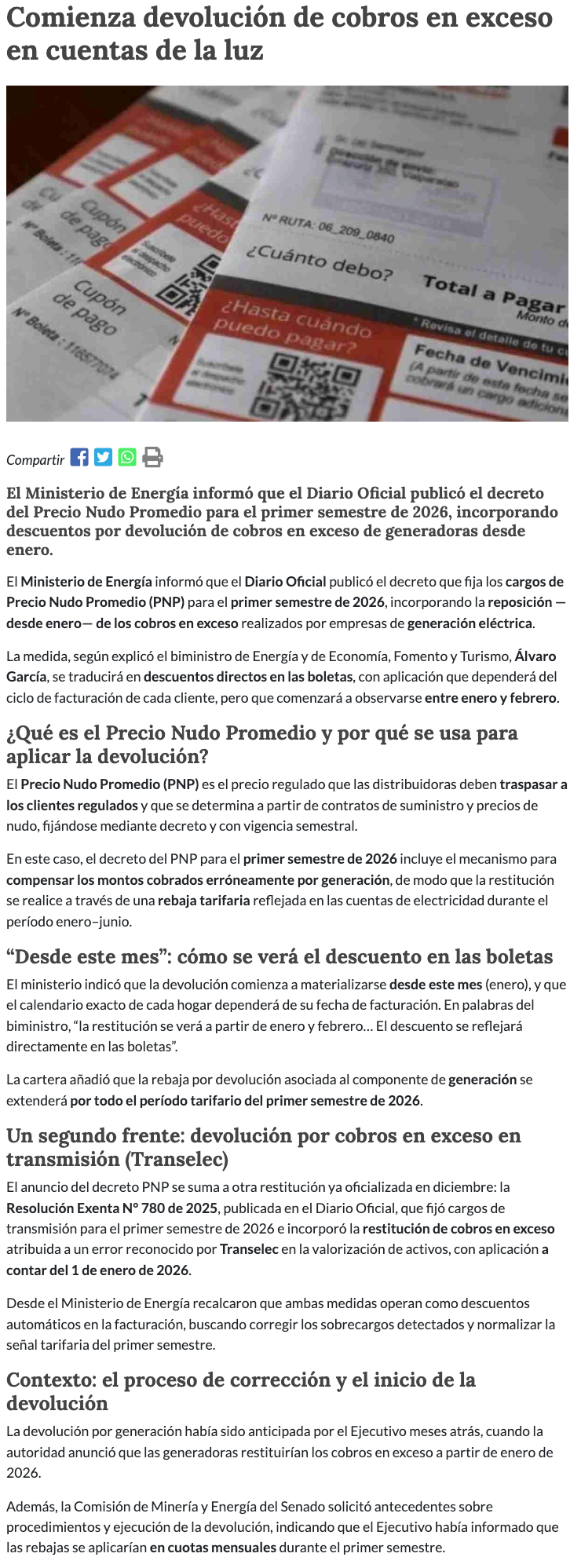 Cuentas de la luz: Gobierno publica decreto que permite devolución de sobrecobros de generadoras - (Diario Financiero)