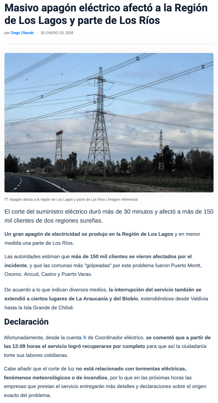 Masivo corte de luz afecta a gran parte de la región de Los Lagos - (atentos.cl)