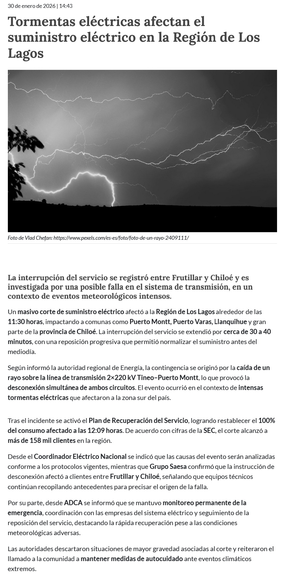 Región de Los Lagos: Corte de suministro eléctrico se originó por impacto de rayo en línea de transmisión - (radiosago.cl)