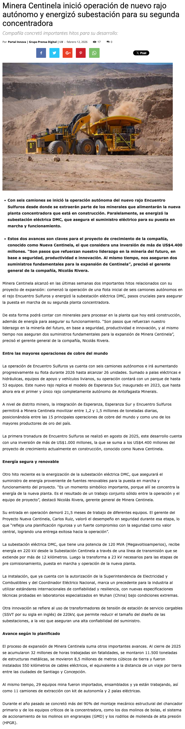 Minera Centinela inició operación de nuevo rajo autónomo y energizó subestación para 2da. concentradora - (revistacrisol.cl)