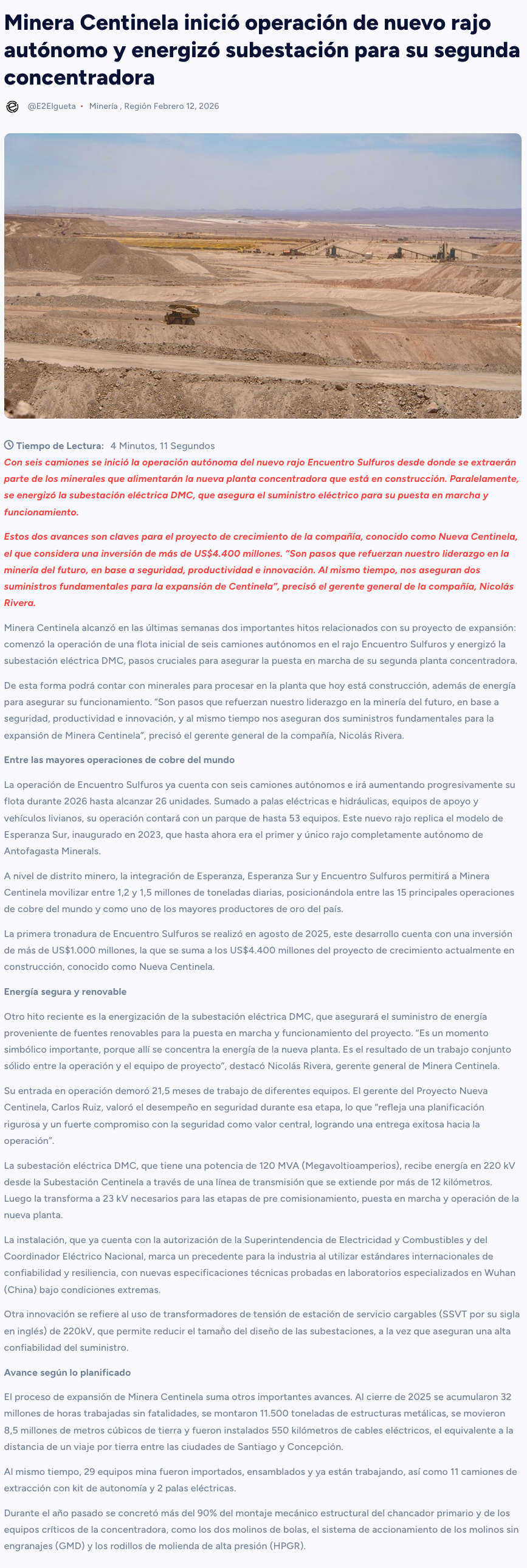 Minera Centinela inició operación de nuevo rajo autónomo y energizó subestación para su segunda concentradora - (portalinnova.cl)
