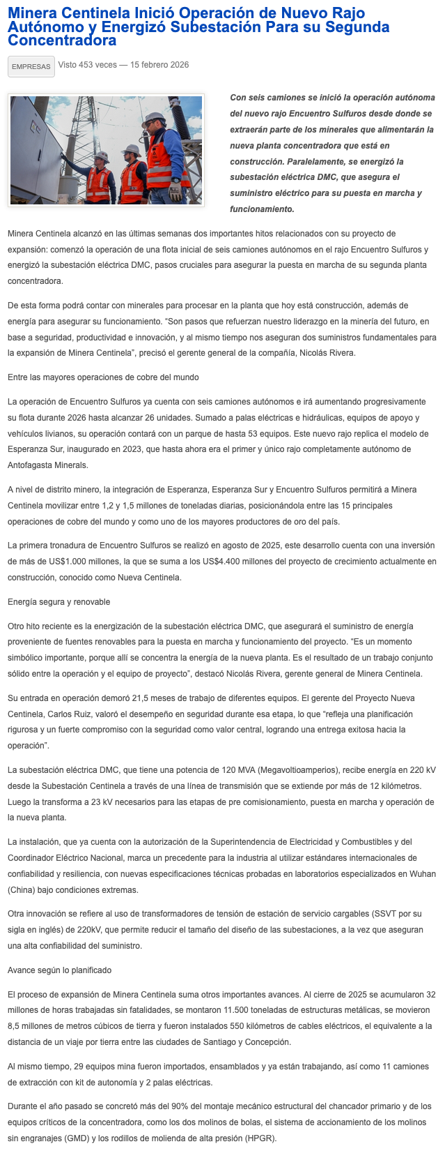 Minera Centinela inició operación de nuevo rajo autónomo y energizó subestación para su segunda concentradora - (calamaenlinea.cl)