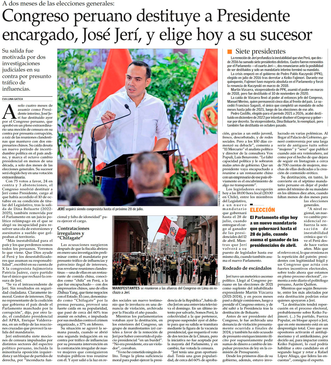 Presidente peruano José Jerí es destituido por el Congreso a poco más de 4 meses de asumir el cargo - (La Tercera)