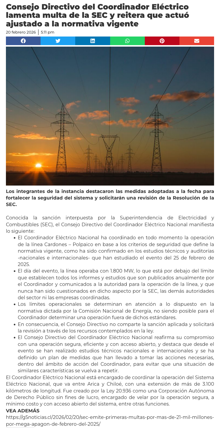 Coordinador Eléctrico Nacional cuestiona multa de la SEC por megacorte y pedirá que se revise la sanción - (puranoticia.cl)