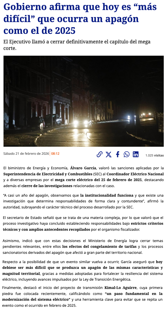 Biministro García valora cierre de procesos de investigación de parte de la SEC por apagón del 25F - (electromineria.cl)