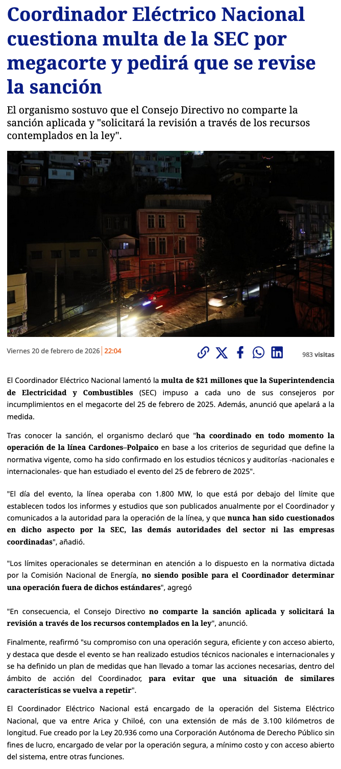 Consejo Directivo del Coordinador Eléctrico lamenta multa de la SEC y reitera que actuó ajustado a la normativa vigente - (g5noticias.cl)