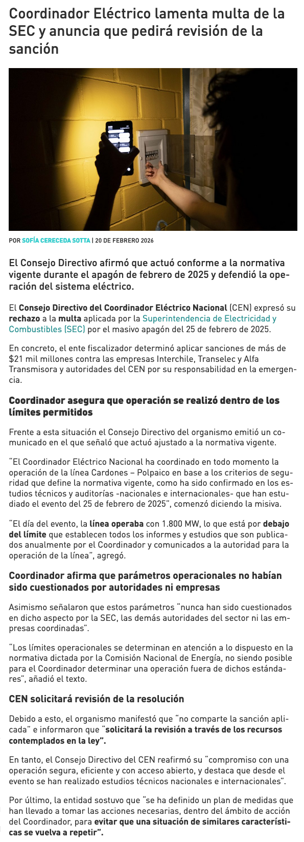Coordinador Eléctrico Nacional cuestiona multa de la SEC por megacorte y pedirá que se revise la sanción - (puranoticia.cl)