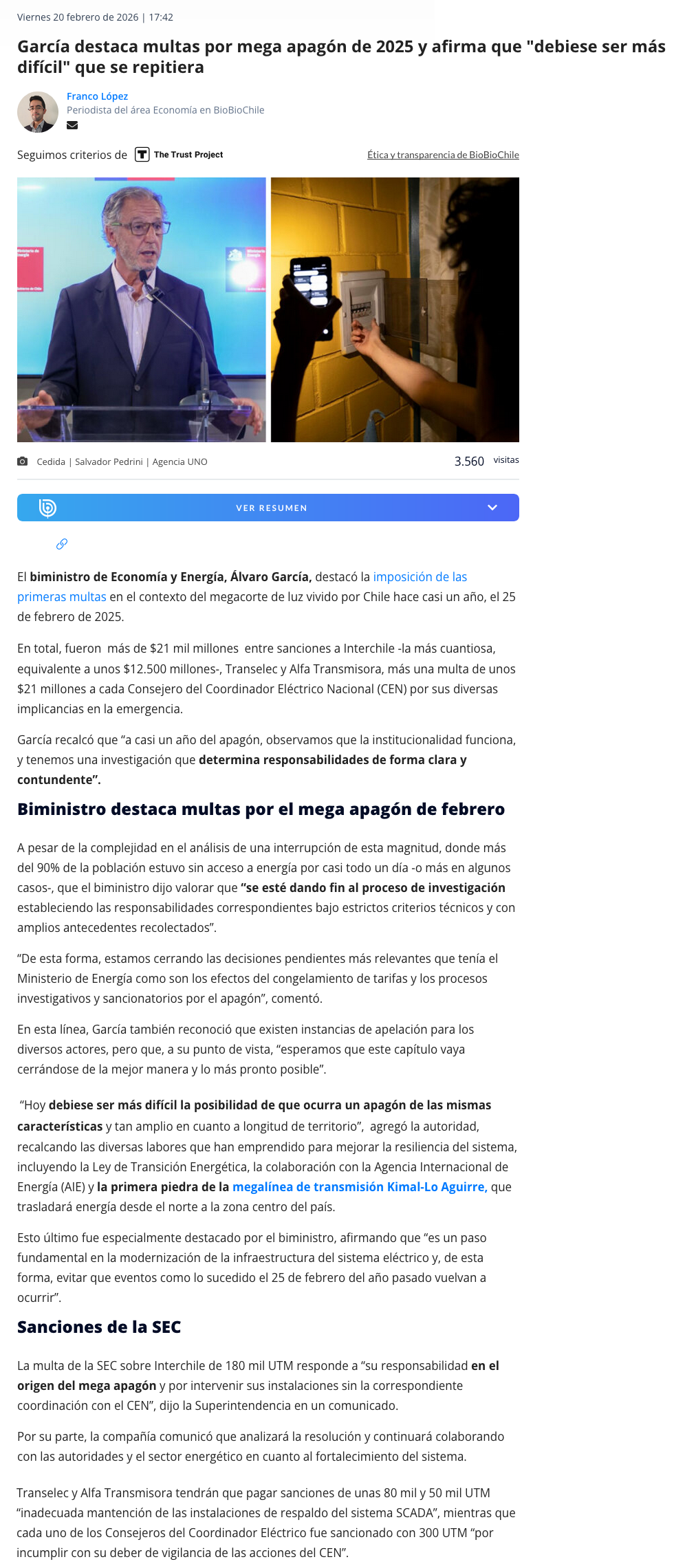 Biministro García valora cierre de procesos de investigación de parte de la SEC por apagón del 25F - (electromineria.cl)
