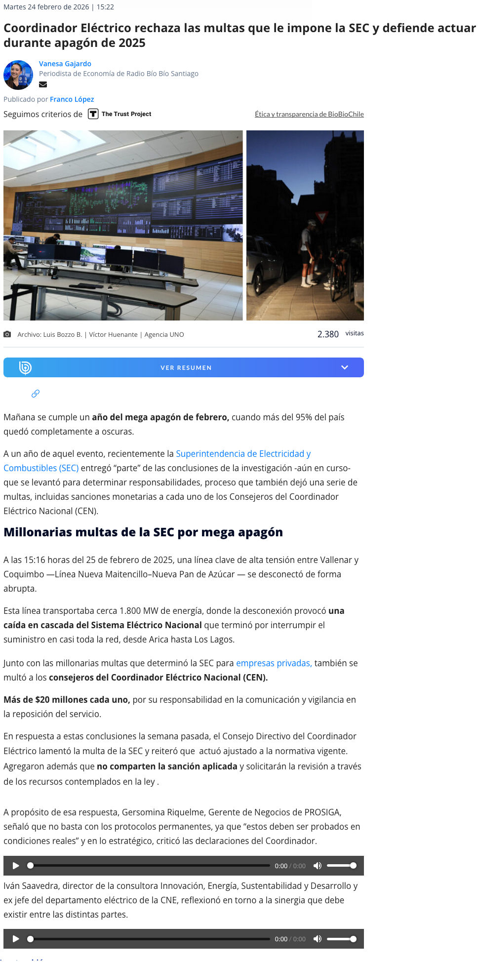 Coordinador Eléctrico rechaza las multas que le impone la SEC y defiende actuar durante apagón de 2025 - (La Región)