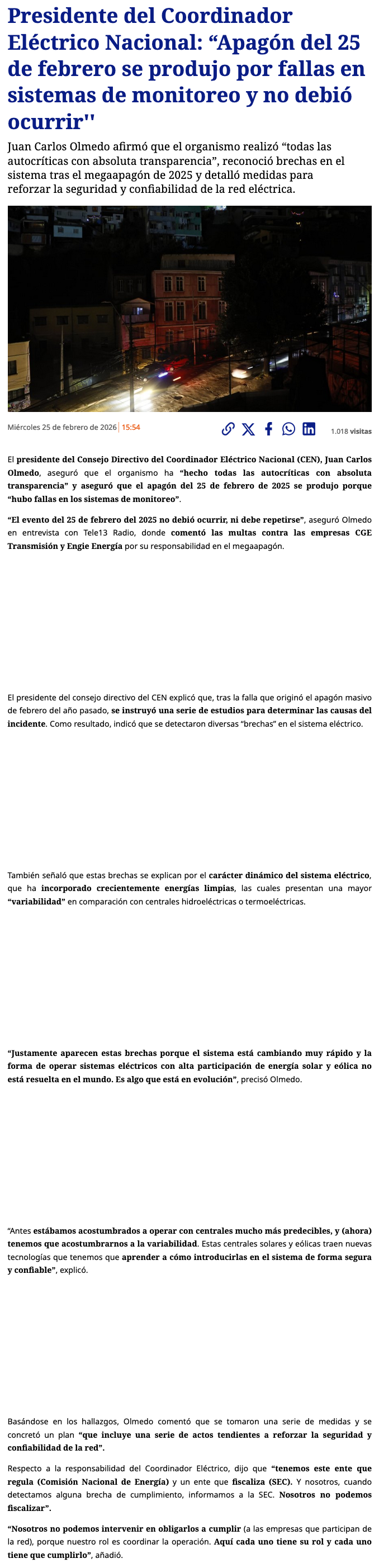 Presidente del Coordinador Eléctrico tras multas de la SEC por apagón: “El evento del 25 de febrero no debió ocurrir, ni debe repetirse” - (La Tercera Online)