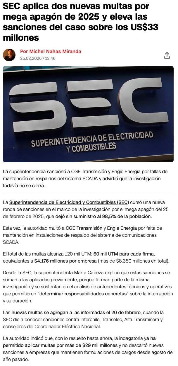 SEC suma multas por mega apagón del 2025 para CGE y Engie Energía: deberán pagar 60 mil UTM cada una - (radio.uchile online)