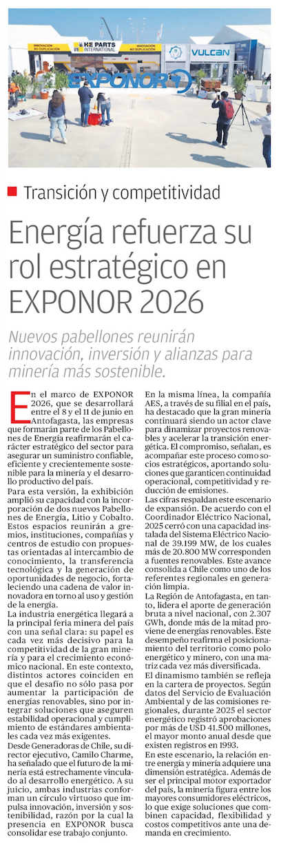 Energía y minería: El vínculo estratégico que marca la agenda de Exponor 2026 - (mch.cl)