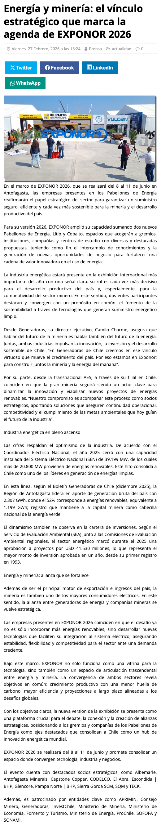 Energía y minería: El vínculo estratégico que marca la agenda de Exponor 2026 - (mch.cl)