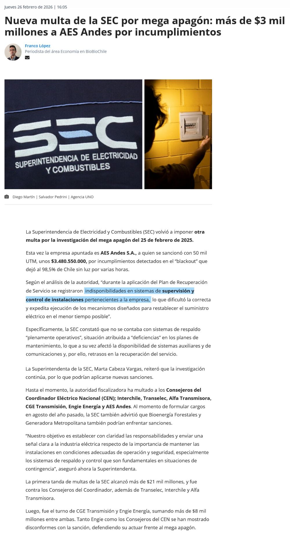 SEC multa por más de $3 mil millones a AES Andes S.A. por mega apagón ocurrido en febrero del 2025 - (puranoticia.cl)