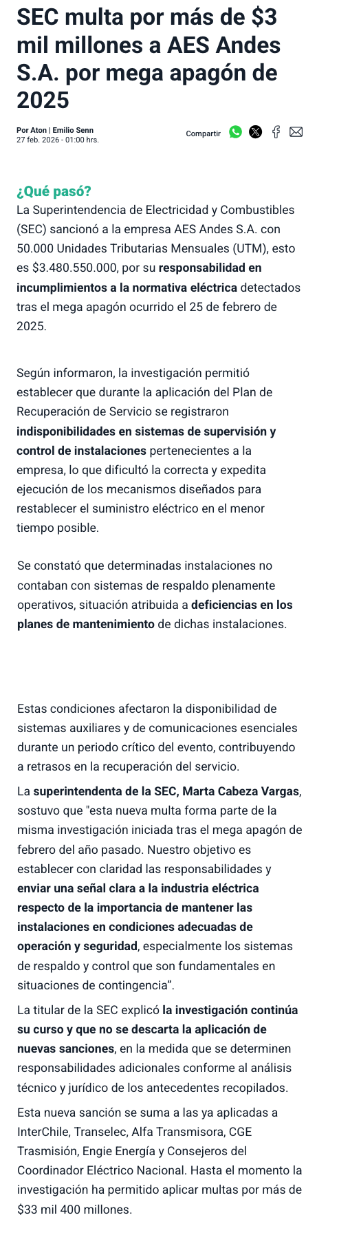 SEC multa por más de $3 mil millones a AES Andes S.A. por mega apagón ocurrido en febrero del 2025 - (puranoticia.cl)