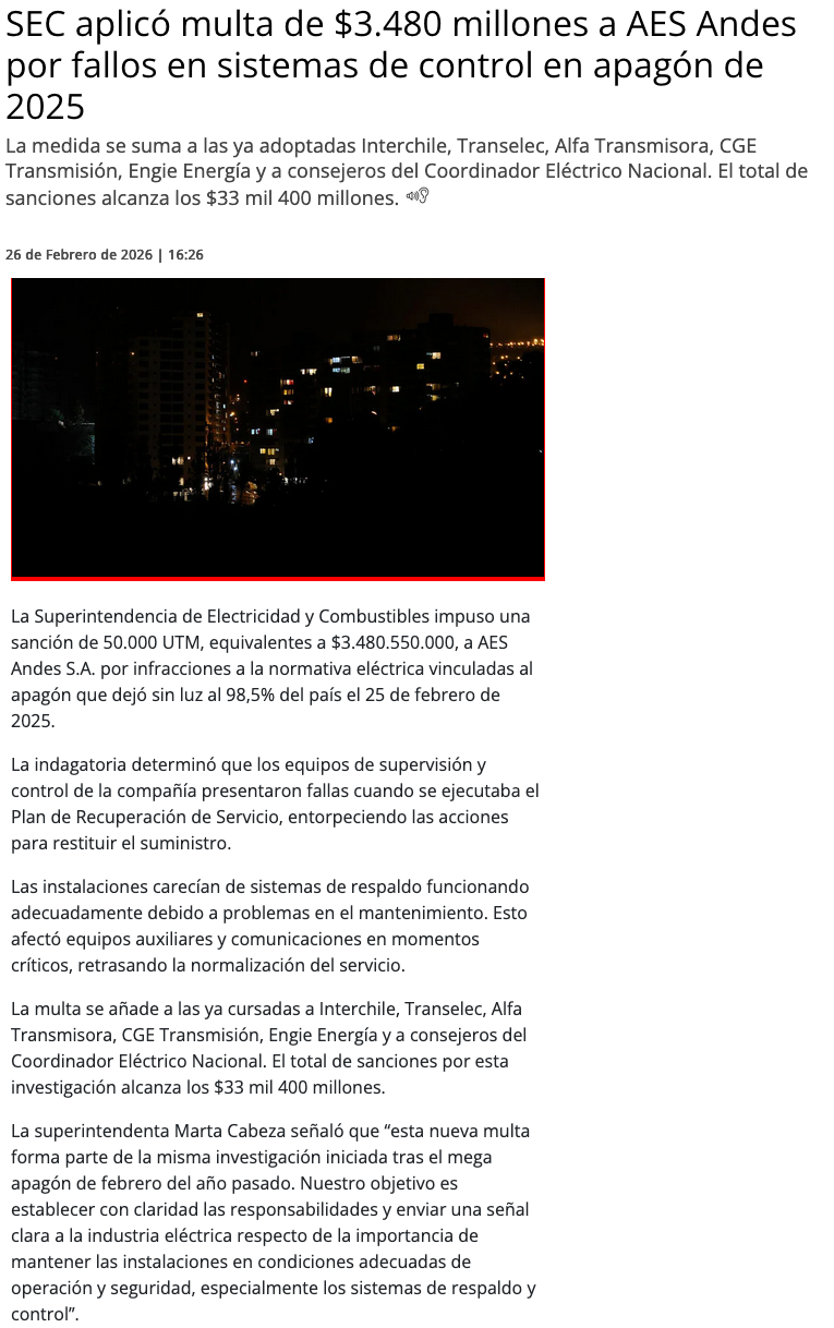 SEC multa por más de $3 mil millones a AES Andes S.A. por mega apagón ocurrido en febrero del 2025 - (puranoticia.cl)